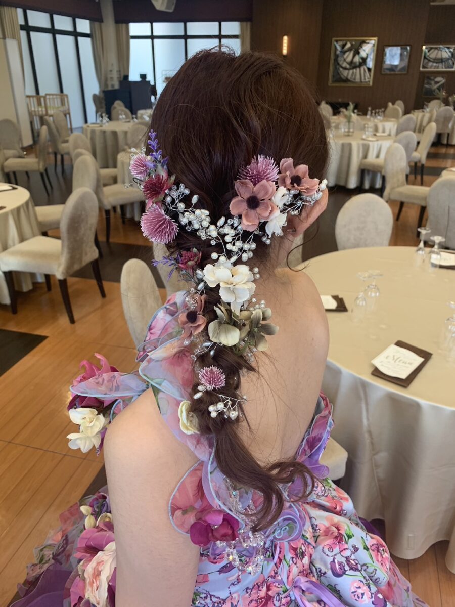 ピンクのドレスに合わせてお花いっぱいの編みおろしアレンジにしてみました🌷♡